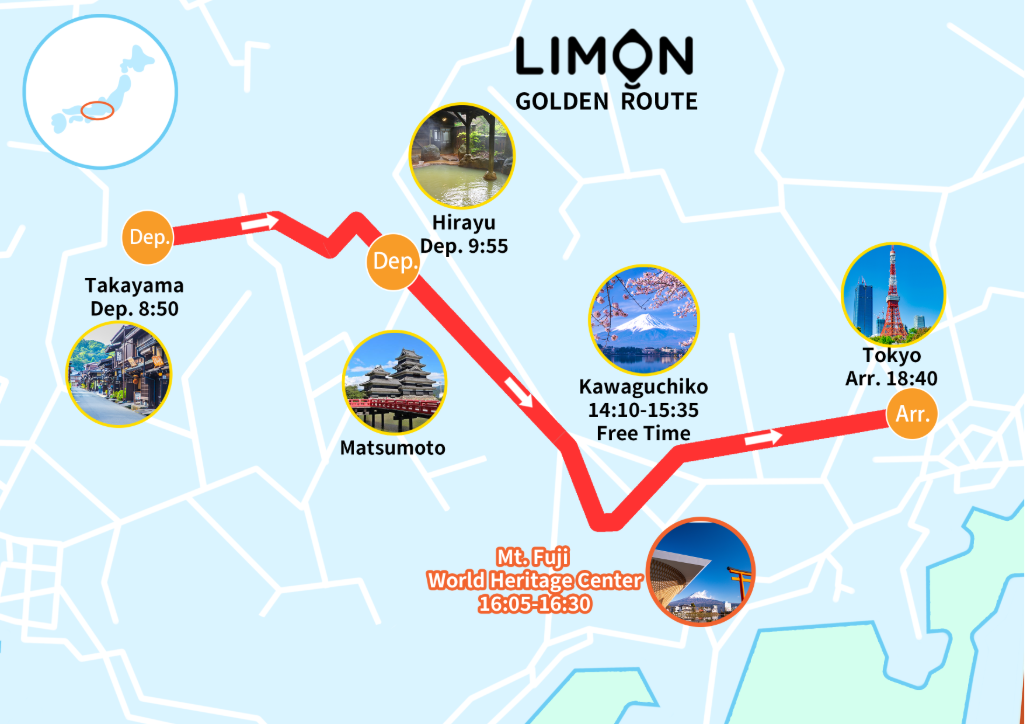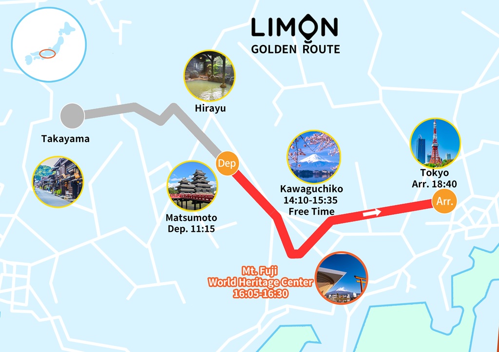 高山 ⇒ 平湯 ⇒ 松本 ⇒ 河口湖 ⇒ (富士山世界遺産センター) ⇒ 東京・八重洲