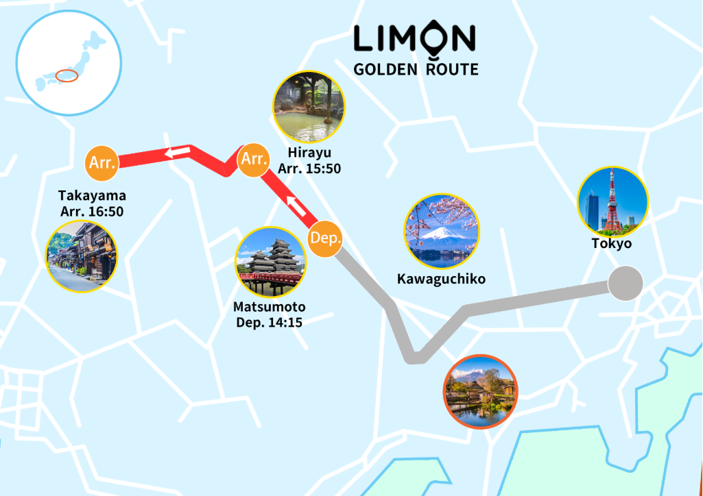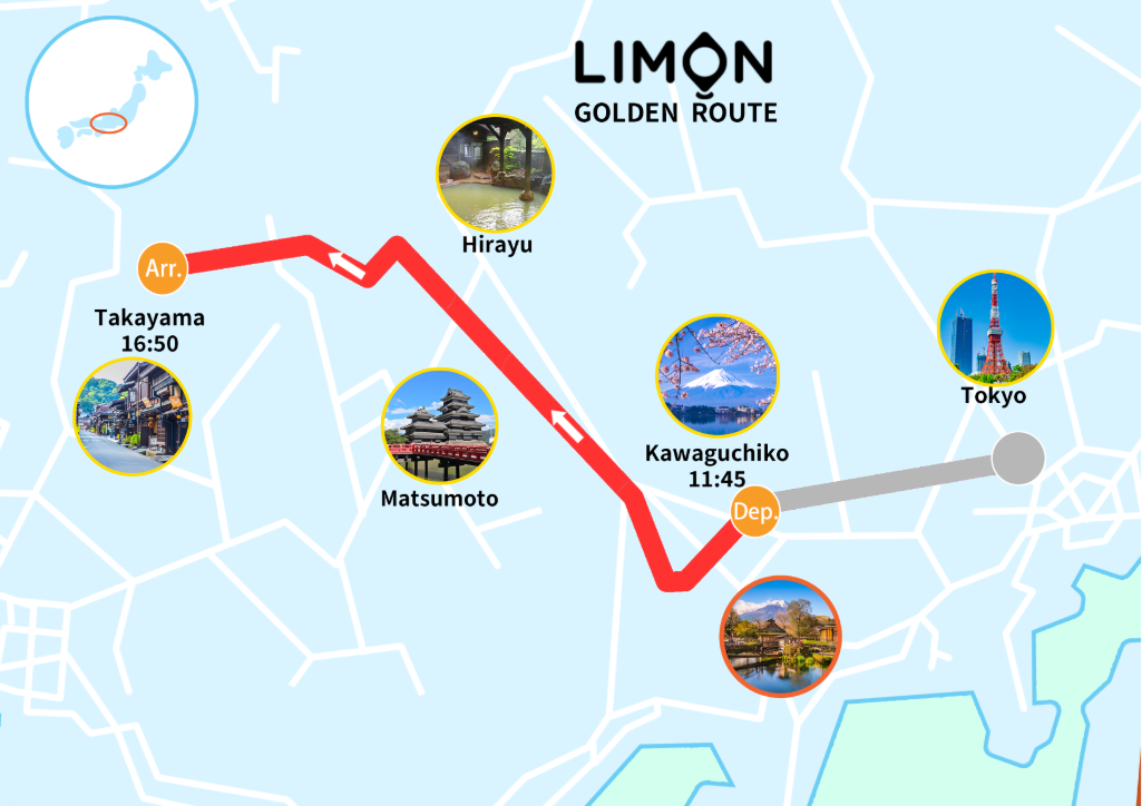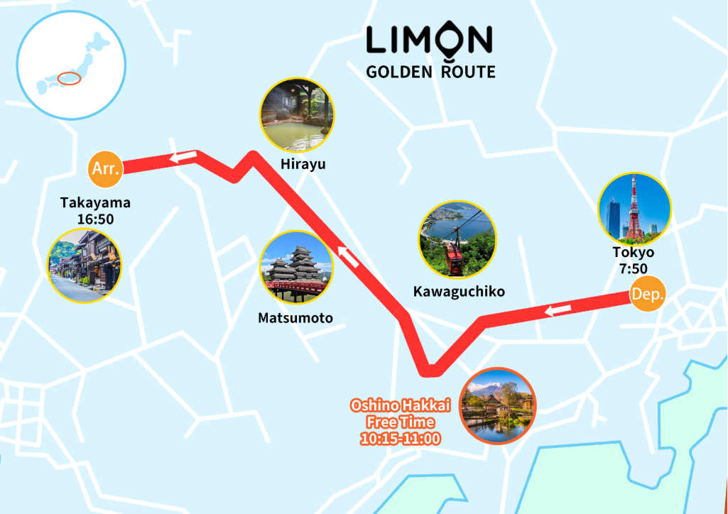 東京・八重洲 ⇒ (忍野八海) ⇒ 河口湖 ⇒ 松本 ⇒ 平湯 ⇒ 高山